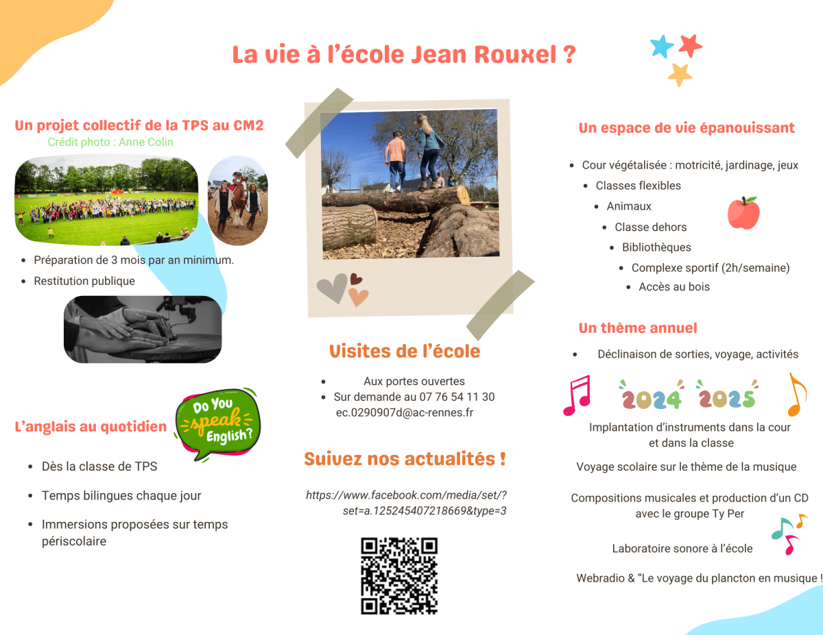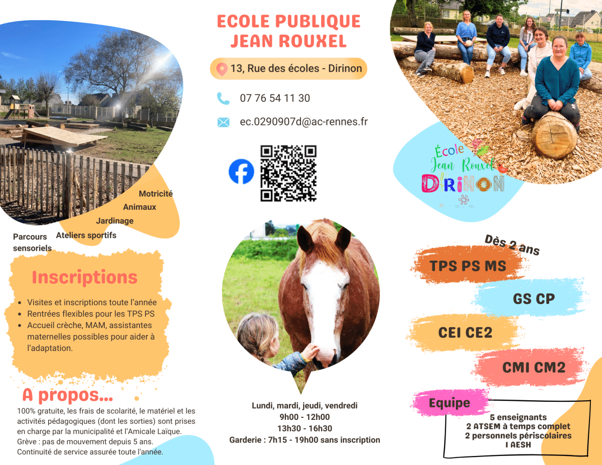 Les parents souhaitant inscrire leur enfant à l’école primaire publique Jean ROUXEL peuvent prendre contact avec l’école au 07 76 54 11 30 ou par mail ec.0290907d@ac-rennes.fr.